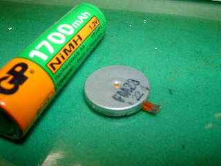 1.2Vのニッケル水素電池をつなぐと元気に動く。手を離すとそこら辺を飛び回るくらい。 |