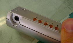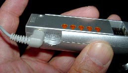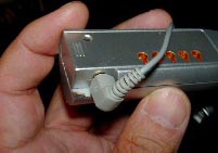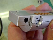 本体はUSBメモリとして動作するわけだが、MP3プレーヤーとして使うときにはバッテリーケースに接続することになる。 ヘッドホンをつなげるところはバッテリーケース側にこのような穴が空いているが、この設計では、抜き差しするたびにヘッドホンをはずさなければならない。何度も抜き差しするのはプラグやジャックにとっていいことだとは思えない。また、本体とのロックは、左側の写真の通り、メモリの真ん中に切った溝にノッチが引っかかることでなされるようになっていた。 |