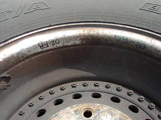 はずしたタイヤには内側をウエスで拭いて、このようにこのシーズンにどこへ付けておいたかをマークしておく。この表示では、02シーズンにF(フロント)R(ライト)ということで、前輪の右側に使っていたと言うことがわかる。この作業は、全部終わってからまとめて行うので、四輪の位置関係がわかるようにおいておくことが大事になる。