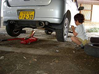 余談となる。上の車は妻と子どもがいないときにやったが、妻の車は翌日行った。年中の長男はこういうときにどうしてもやらせろとうるさい、時間は倍くらいかかるけれど、ちょっとうれしくてノウハウをたたき込んでいる。こういう当然の技術を日本人は皆が持っているはず。これから技家の存続が危ぶまれるが、こんなこともわからない子どもも増えてしまうはずだ。(もちろん、なくなって困るのはここの技能と言うより、自分でやるスタンスや構造に思いをはす心だ)クロスレンチはもう一つ買っておかなきゃダメだな。ちなみにこの車は軽いのでデフにジャッキをかませて両輪一度にあげている。サファリのタイヤ交換を思えばへみたいな作業だ。