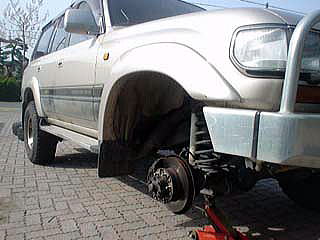 この車は、前後ともフルフロートアクスルを採用しているために、はぶの部分が出っ張っており、タイヤの穴ををボルトに合わせるときにはずっと支える必要がないため、大きなタイヤの割には割と楽にできた。