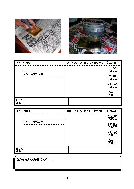 今回は『精密で美しい作品をつくろう』を目標に、各作業については、教師が一度師範を見せるだけで、細かい注意点などは作業の前にそれぞれが資料集や教科書で調べてから製作することとした。一つの作業にひとまとまりの記述形式として最初の時間に全員に配布してみた。