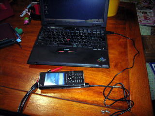 ○その1 USBポートから充電するケーブル。100円ショップで売っている携帯電話用の充電ケーブルを切ってW−ZERO3にあうコネクタ(近くの電気パーツショップでコード付きのものが300円だった。本来ならプラグだけの方がスマートにできあがるし安上がりだろうけれど、それは置いてなかった)を直接接続した。ACアダプタにも書いてあるように真ん中が+になるように接続しただけ。