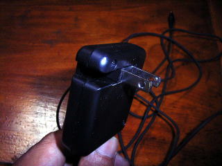 ○付属の充電器。5Vで1Aの出力。どんなものでも代用がききそうなので、適当なACアダプタを手に入れてコネクタだけあわせて、行く先々に置いておくのがよいだろうか。
