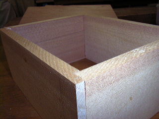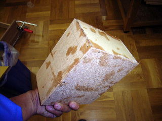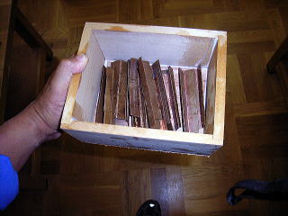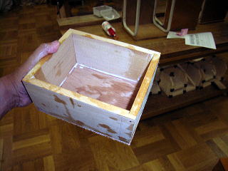 できた箱を上から。コルクベニアを使ったが、今回は底を溝にはめ込まなかった(横切り盤ののこカバーを取り外さないと長い板は溝が引けないので面倒だった)ために底からベニアを打ち付けた。
