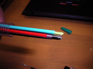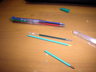 4色ボールペンを分解して、緑色のペンを抜き取った。(緑色はあまり使わなかったのに加えて、そこへ差し替える軸も緑色でちょうどよかった)