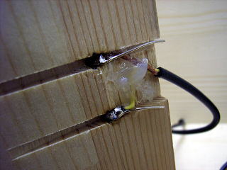 裏側部分、出てきた針金に電源からのコードをハンダ付けした後、少し長く後ろに伸ばしてクッションにした。可動範囲は1mmもないけれど、多少は吸収できるかな。