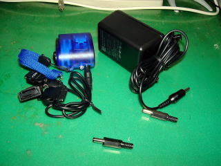 今回使った部品、左のは各種携帯に対応したダイナモ充電器。もちろんesにはそのまま使えないけれど、5Vが出ているしDCジャックで出力しているので汎用的に使える。しかも、ちょうど右側のACアダプタ(あきばおーにて購入した168円の5V500mA、まめからというおもちゃ用のもの)のDCプラグと同じ規格だった。