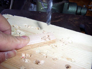 材料は2年前に使った1年生の木工でのあまり材(テーブルの天板を切った端材)。それを2組の2辺に切った。 表面は軽くベルトサンダーをかけて、片方に3mmのドリルで穴を開ける。 6mmのドリルで座ぐりをした後、もう一枚に木ねじで留める。