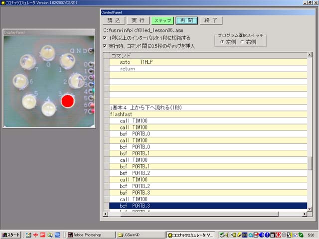自分が伝えたのは点灯命令と、消灯命令、後は時間の命令だけだからソースからその部分を抜き出して画面に表示してくれればいいというものだったが、このプログラマにかかったら、PICの持つ命令を解析してその通りに動くエミュレータに仕上げてくれた。これならば生徒が自分で組んだサブルーチンなどにもすべて対応できる。まさに脱帽。