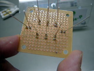 出口は普通のACコネクタ(120円)。左側はブレッドボードに挿したパネルLED。