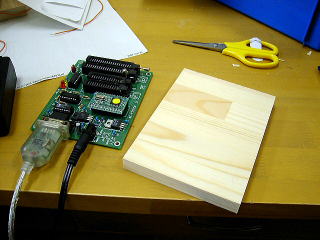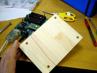 PICの差し込み部分だけを出して覆ってしまうようなケースも考えてみたけれど、あまり大きくなってしまうのも考え物なので、下に板を付けるだけにした。材料は1年生の端材。木目が横になってしまうのは仕方がないということで。