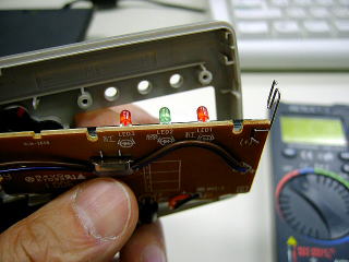 LEDの基板部分。真ん中のLEDだけ基板にかかれた図記号と逆に取り付けてあるけれど、今までは正常に動作していたというので、そんな理由では無かろう。