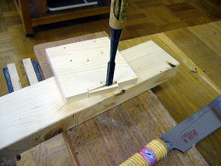 底板の加工。首の部分の板がはまりこむようにのこぎりとのみで切り込みを作った。