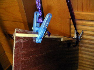 梱包テープで完全に留めた後、上辺にそって割り箸をテープで取り付けた後、洗濯ばさみでつるすようにした。