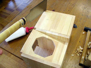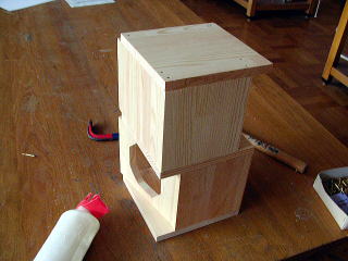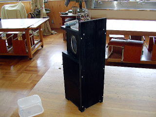 1年生のあまり材を利用し、スピーカの面は少し傾けて、飛び出た部分をのこぎり&かんなで仕上げて、後ろの板を付けた。