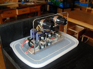 アンプは秋月電子のキットで1000円。スイッチやボリューム、入力端子はペット材に配置した。