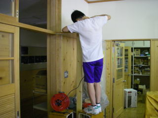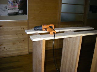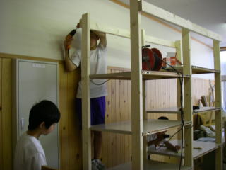 職員室を耐震工事のために一度取り壊したので、古い棚などから板をもらってきていた。