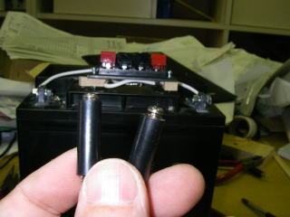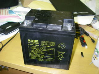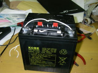 中古のシールドバッテリー(12V24Ahで1400円)を購入して、端子を直接バッテリーにネジ止めした。