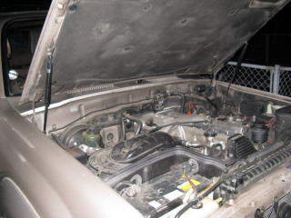 ランクルのエンジンルーム。運転席前にブレーキのマスターシリンダーと倍力装置がついている。