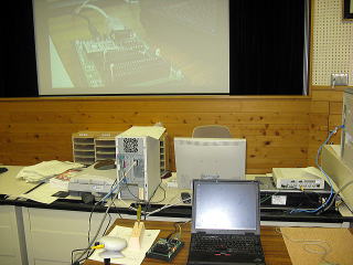 道具を片付けたところ。右側の写真は授業で手順を紹介するときの様子。PC用のプロジェクターにカメラ(左下に映っているもの)を使ってライターの様子を映し出している。