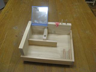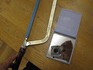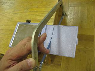 100円ショップで買ってきた鏡を取り付ける。足の部分を弓のこで切断する。