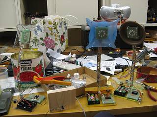 完成したところ。ごちゃごちゃした机でわかりづらいが、一番左は転倒スイッチ(左と真ん中の間に立てた板についている)により板が転ぶとランプがつくタイプにした。もう一つ、秋月の人体検知センサー(完成品850円)を使ったものも作ったが、どうやらセンサーが壊れているらしく動作しなかった。