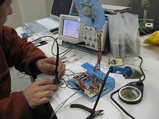 オシロスコープにつないで、センサー素子の出力からアンプの終段まで追っていっている図。