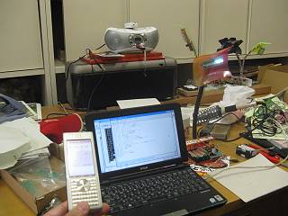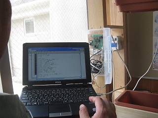 研究室で、普通のココナッツに流し込んでバグ取りをしている様子。机上で開発環境を構築できるのもいいよね。