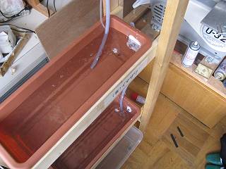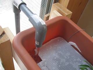 ポンプが稼働すると、そこそこの水量で供給を始める。プラスティック段ボールは針金をS字にしてつってある。