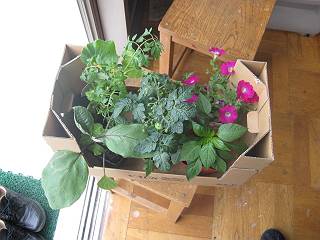 一番下の段は、ズッキーニとサフィニア。とりあえずいろんな種類をということで・・・・