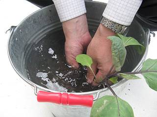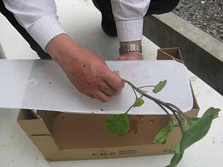育苗ポットから出して、土を落とし水で洗ってプラスティック段ボールに差し込む。