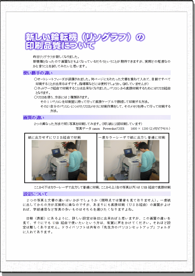 これを2つに分けて、USB直接印刷と、今までの輪転機時代に考えられる写真が一番きれいに出力できる方法(カラーレーザに出力して原稿を作り、これを文字写真モード(写真優先)で印刷)とで、2度上書き印刷してみた。
