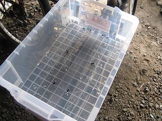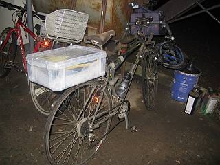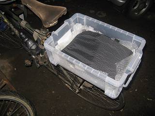 そこで、後ろのキャリア(着脱式)に取り外し式のバッグをつければいいかなと思ったが、市販品は馬鹿高いし、アタッチメントを探したがいいものがなかったので、ふた付きのケースを固定してしまうことにした。