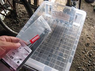 そこへ工具ケース(680円)をのせて、キャリアの位置に穴を開けてロックタイで固定する。