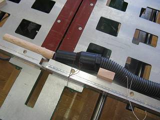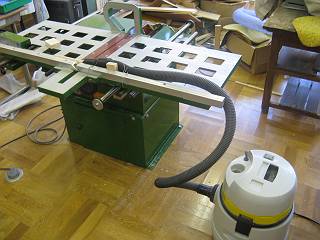 これだけ小さいと、切り終わった瞬間に丸鋸の刃にはじかれて危険なので掃除機で吸い込むようにセットしてみた。