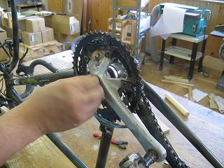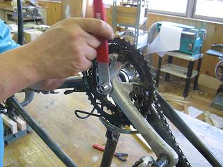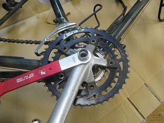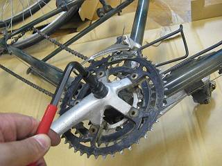 コッターレスクランクなので、14mmのボックスレンチでゆるめた後は、専用のクランク外し工具を使う。