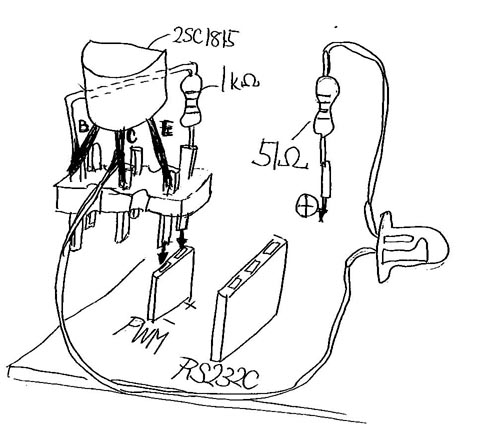 pwmポートの上にピンヘッダを2列の状態で刺し、2SC1815と抵抗を取り付ける。