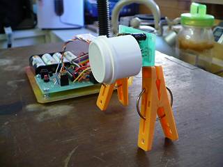 現在、技準で稼働させっぱなしになっているので前を通過すると点灯する。電池はもったいないので、外部DC入力に充電式4本の電池ボックスを接続している。