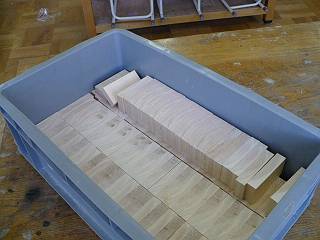 全部で104個作ることにして、まずは縦の板を切り出してゴミ入れ用の穴を開けた。
