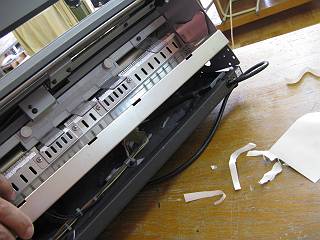 紙送りのベルトが外れているだけだが,中のプーリーが複雑なので,一通り分解しないと修理できないようだ。
