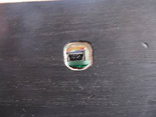 USBコネクタ用に側面に開けた穴。10mmのドリルで開けた後やすりで広げた。