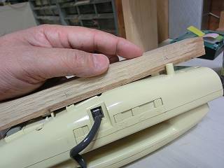 手押しで基準面を作って、自動かんなで角材にした。それを電話のカーブに当てて、出っ張ったところを受ける穴を開けた。