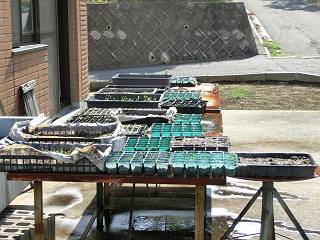 芽が出たことで、すべて外のテーブルに並べて日に当てることにした。