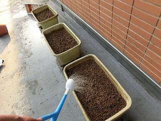 まず、水をたっぷりかけてから、買ってきた苗を植える。