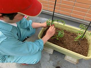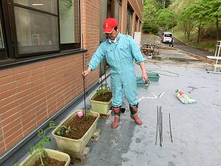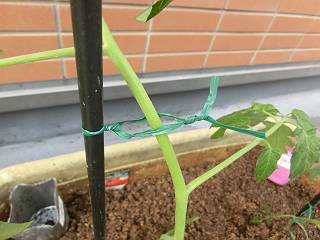 もう苗は大きくなっているので、支柱を立てて誘引する。