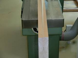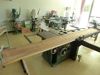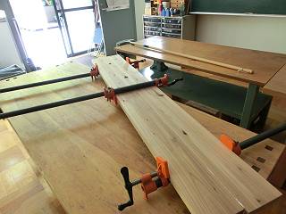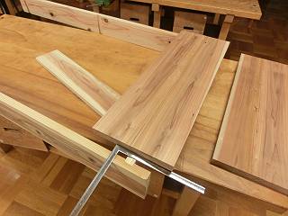 テーブルの天板にするために板をはぐ。木裏が上になるように背中合わせで削ってから2枚をあわせる。