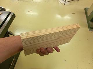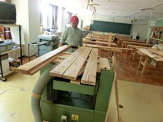 手押しをかけて基準面を出し、自動鉋盤で厚さをそろえる。さすがにスギは反りやすいので、24mmまで削ってそろえた。