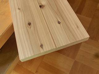 スギは針葉樹で柔らかいので、どっしりとした家具には向かないから造作用の材料としてラフな机にする。