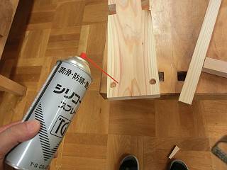 今回はビスケットジョイントカッターを使ってもらうのも一つの目的。ハタガネで締めて少し待つ。
